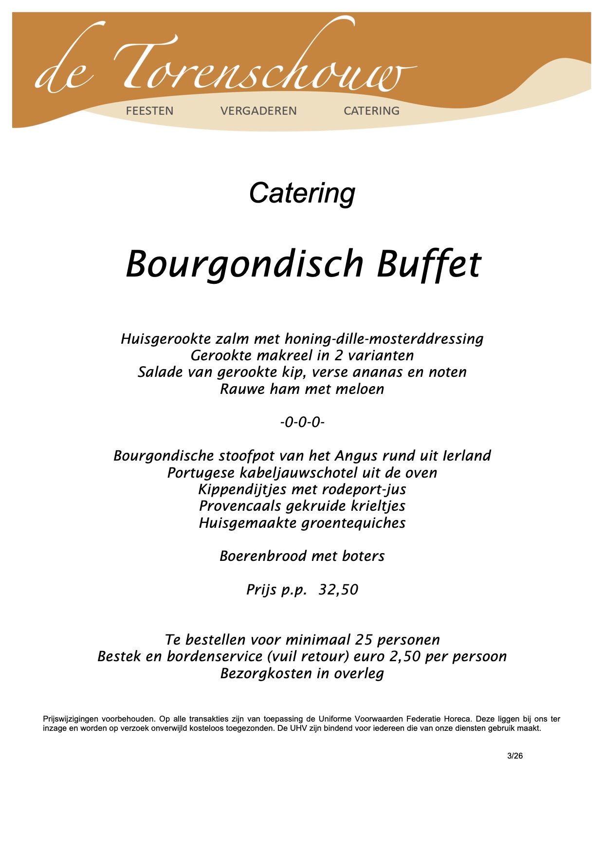 Een warm en koud buffet, luxe hapjes, bijzondere belegde broodjes of een complete barbecue. Cateraar en partycentrum De Torenschouw regelt het allemaal. Vier uw feest bij ons in Opperdoes of laat onze ervaren koks de warme en koude buffetten bij u op locatie verzorgen. We bieden verschillende arrangementen die we uiteraard naar uw wensen kunnen aanpassen.